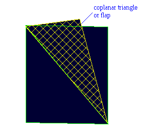 Remove Trifications is optional and controlled by the Coplanar Triangles/Retain Coplanar Triangles confirmation prompt. This step is designed to remove any trification problems (i.e. where three triangles share a common edge). This will happen when you create a triangulation of an orebody and then add some coplanar triangles to it (sometimes called 'ears' or 'flaps'). There will be a trification where the flaps join the orebody. This may happen during sectioning of triangulations. If the section is parallel to a bench of a pit, then the sectioning process can form these flaps. The second step searches for the trification boundaries and removes all triangles of one side of the trification boundary (the correct side), thus removing the problem.