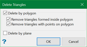 Use the Delete option to delete triangles from a solid. This option is used to delete triangles associated with the original polygons (from which the triangulation was generated). You can delete triangles that are inside and/or with vertices touching a polygon or triangles that intersect a plane.