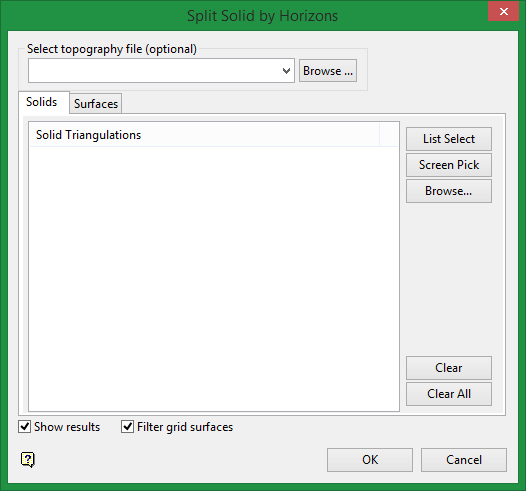 Select the solid triangulations that you want to split, either by using the list select tool, screen picking the triangulations, or by browsing for the required solids.