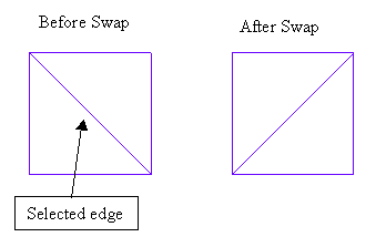 Select the second triangle to swap. The position in the triangle that you select determines which edge (will be swapped) and consequently the other triangle. The edge closest to the selection position is chosen if it is also part of another triangle. If it is not part of another triangle, then a message displays informing you that you have selected a boundary triangle.