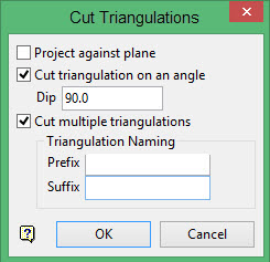 Select this check box to project against a nominated plane. The plane on which to project the cutting line is defined through the Projection Plane panel, which displays when the Cut Triangulations panel has been completed. If this check box is not selected, then the cutting line will be projected upon the XY plane.