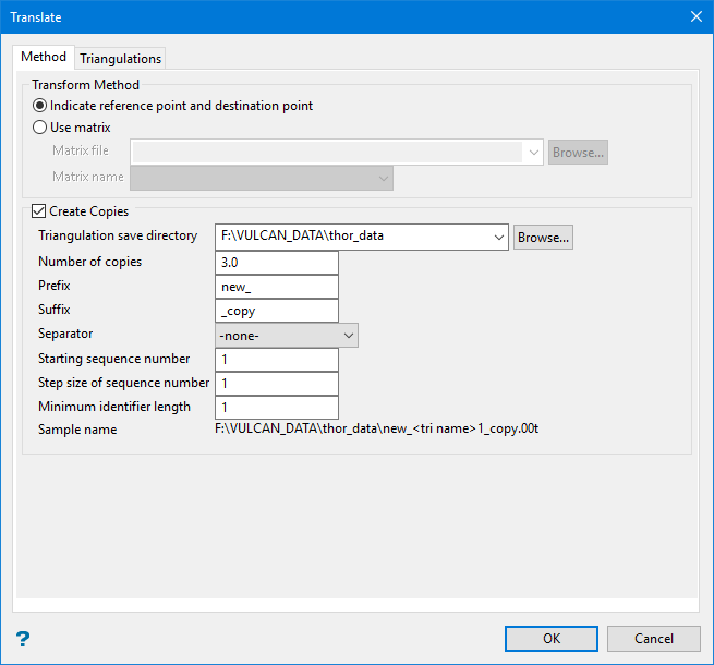Use the Translate option to move a triangulation to a new position. Alternatively, a copy can be created and moved to the new position. This option requires you to indicate two points to define the translation vector. All of the points on the triangulation will be moved the distance and direction specified by this vector.