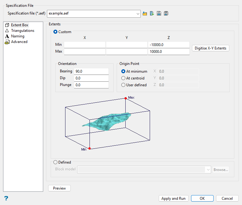Custom: Select this option to use a custom extents boundary. You can either manually define the extents by entering the minimum and maximum X and Y coordinates, or dynamically define them using the Digitise X-Y Extents button.
