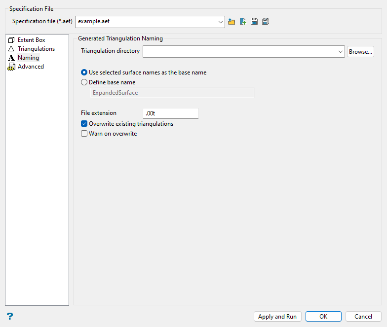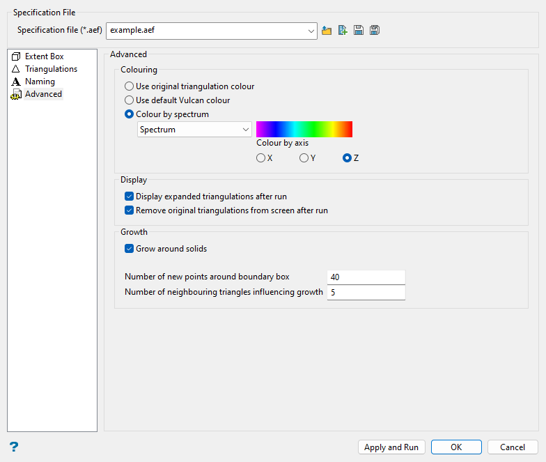 Use the Apply and Run button at the bottom of the panel to save the specifications in the nominated file before expanding the triangulation. Press the OK button if you only want to save the specifications before exiting the option. Click Cancel to exit the option without saving.
