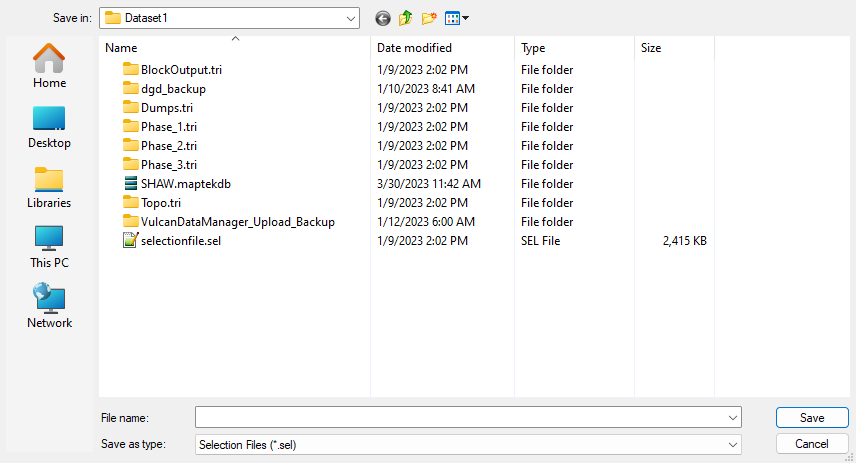 Note: Â You must have all triangulations loaded to the Vulcan workspace that you want to save to a selection file before starting this option.