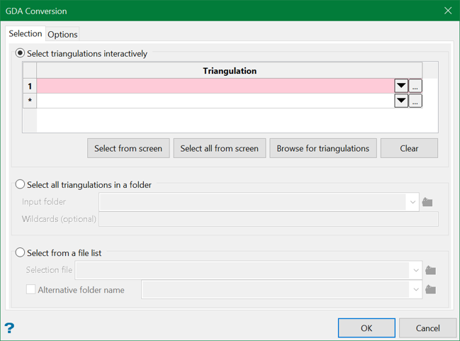 Use this option to select all triangulations residing in a folder. Browse for the folder or choose a recent one from the drop-down list. You can also filter your triangulation selection using the optional Wildcards field by entering the wildcard characters (* and ?) separated by a semi-colon.
