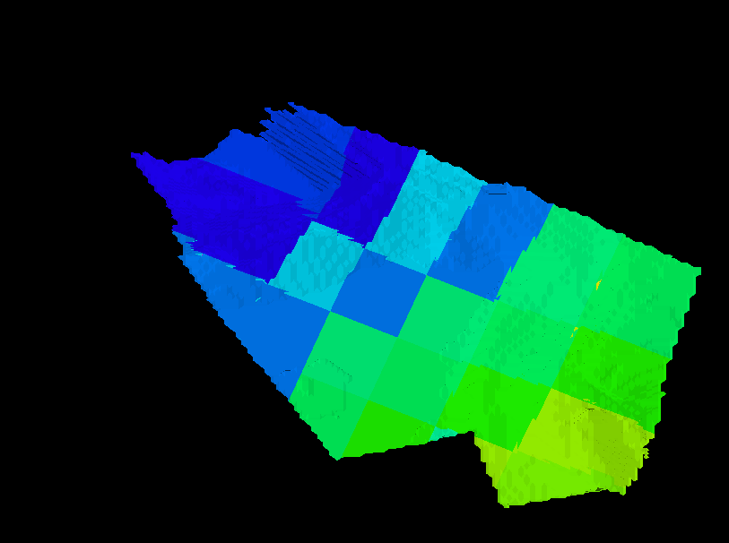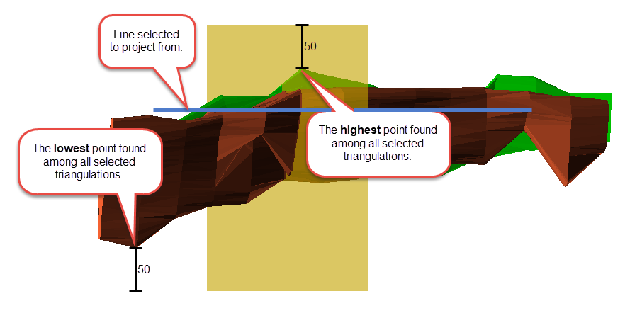 ExampleIn the screenshot below, the Extend Z was set to 50 meters, so the tan cutting shape extends 50 meters above and below the selected input triangulations.