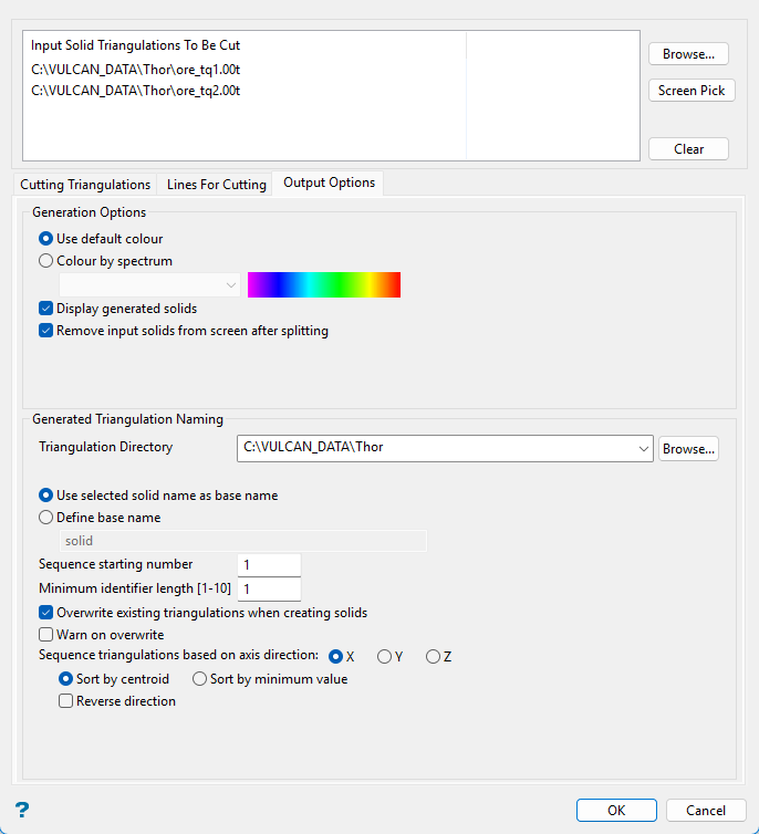 Nominate an axis direction (X, Y, or Z) for the Sequence triangulations based on axis direction option to sort and sequence the generated solids by. After splitting the original triangulation solid, Vulcan will calculate the centroid position for the new triangulations before using the centroid values (X, Y, or Z) to name the triangulations.