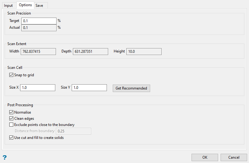 The Get Recommended option evaluates the extents of the input files and calculates a scan cell size to maintain a uniform scan precision throughout the maximum extent.
