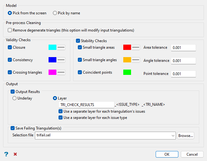 Use this option to check the validity and stability of triangulations. If a triangulation does not pass a selected check, the problem area is highlighted in a custom colour. The results can be displayed as an underlay or saved to a specified layer, and a list of the failed triangulations can be saved to a selection file. The selection file can then be used with the Model >Â Triangle Utility > Repair... tool for triangulations.