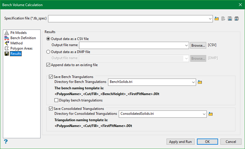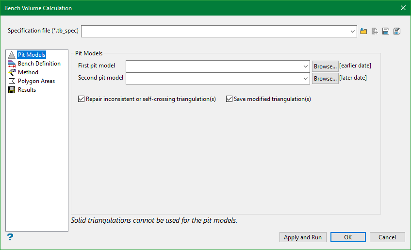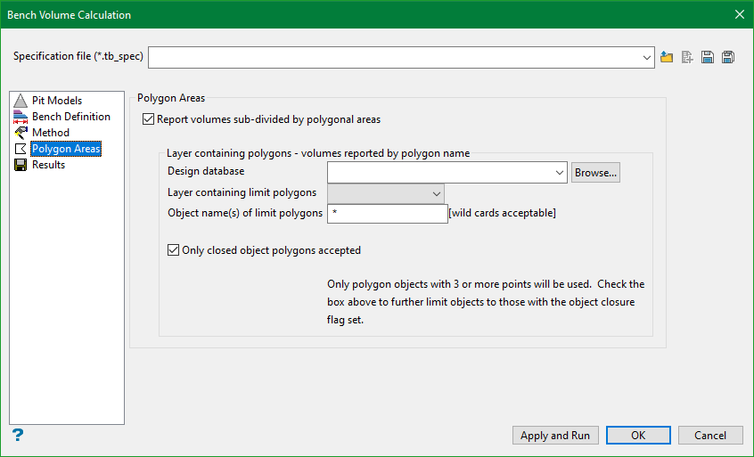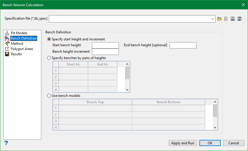 Note: Â The specification file (*.tb_spec) is used to store the parameters used in bench volume calculation.