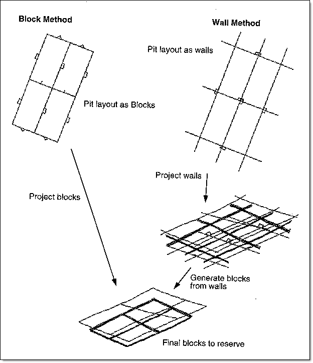 Both methods (using blocks and using walls) result in a series of layered polygons defining the blocks which the reserve calculation menu ( Batvol ) uses to calculate the reserves. The two methods are illustrated in the following diagram.