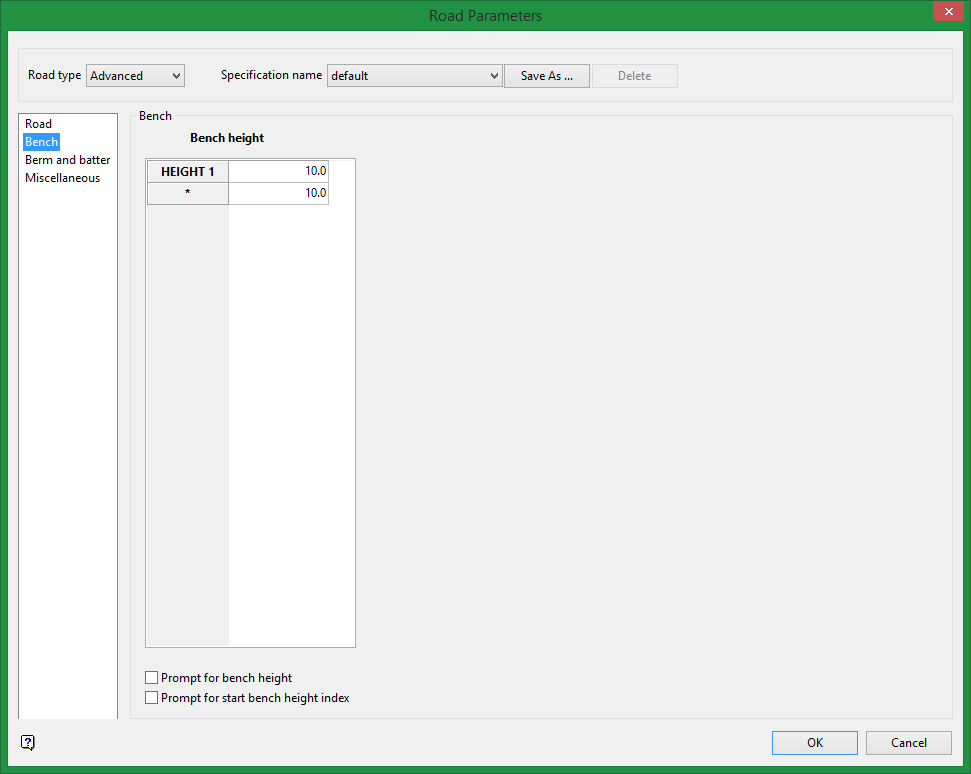 Enter the bench height for the projections and berms used in the road creation. If more than one bench height is specified, then the order in which the heights were entered will be used when creating the road.