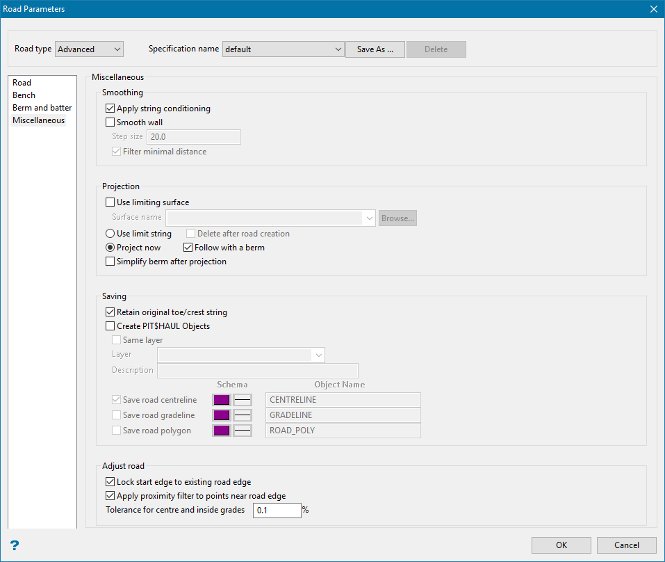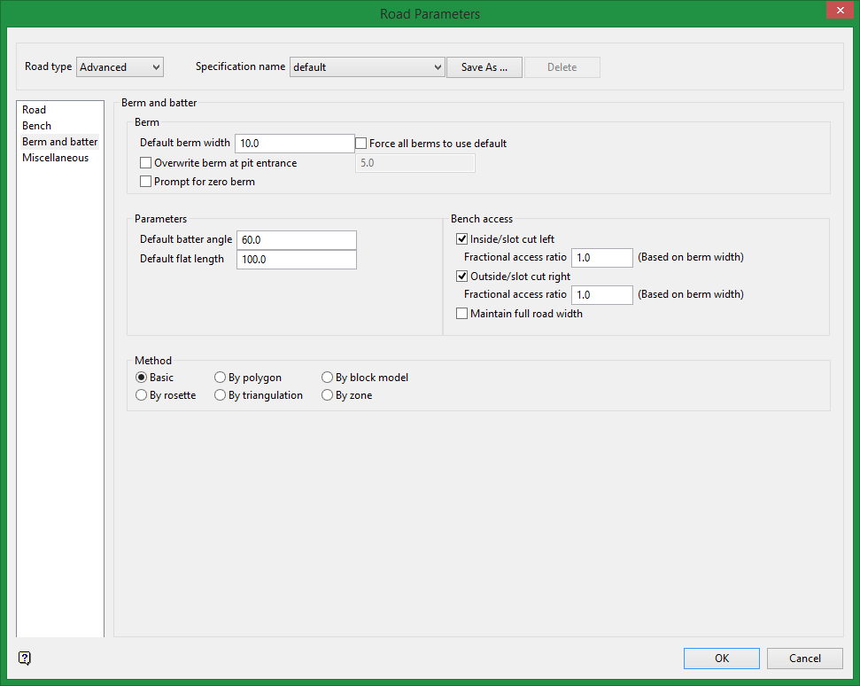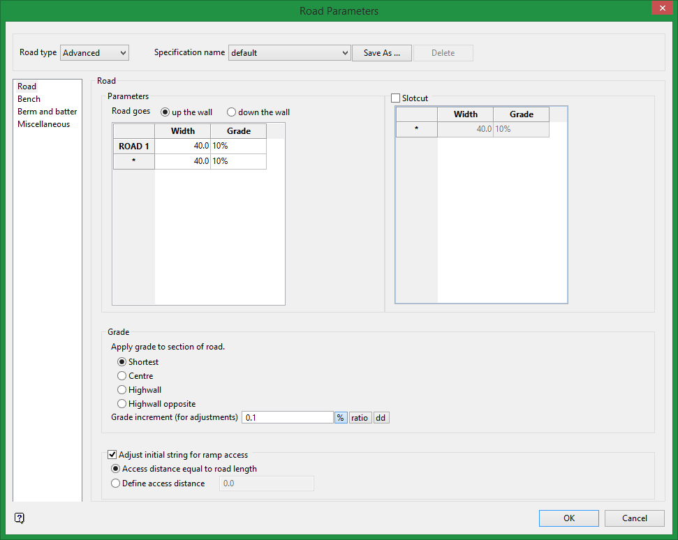 Check the inside/slot cut left and outside/slot cut right check boxes to allow access to the benches on either side of the road. These check boxes must be ticked before the road is created. If a road is inserted and a projection to the bench has been done, then any subsequent berm will be created according to what was ticked here. To change the access to the bench, repeat  insertion of the road.