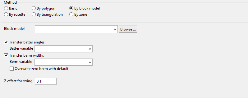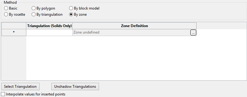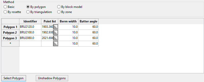 Use this method to use triangulations to define the zone as well as the berm and batter information. The necessary triangulations can be selected from the screen (using the Select Triangulation option), or from a drop-down list (displayed after clicking in a cell under the Solid Name column).
