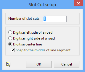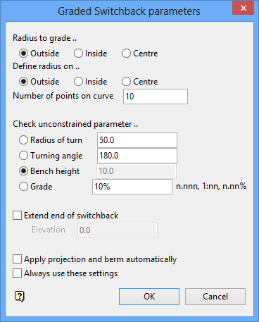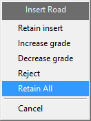 Check the inside/slot cut left and outside/slot cut right check boxes to allow access to the benches on either side of the road. These check boxes must be ticked before the road is created. If a road is inserted and a projection to the bench has been done, then any subsequent berm will be created according to what was ticked here. To change the access to the bench, repeat  insertion of the road.