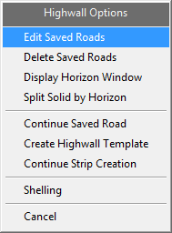 Select Highwall Options in the Create Pit context menu. If the Road Parameters > Highwall panel has been loaded, the Highwall Options context menu appears.
