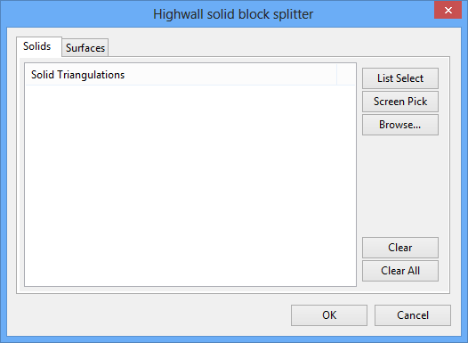 Select the solid triangulations that you want to split, either by using the list select tool, screen picking the triangulations, or by browsing for the required solids.