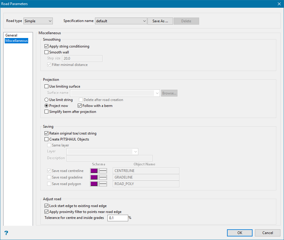The Road Parameters pane provides a way to design a simple road for access to a standard open pit mine.