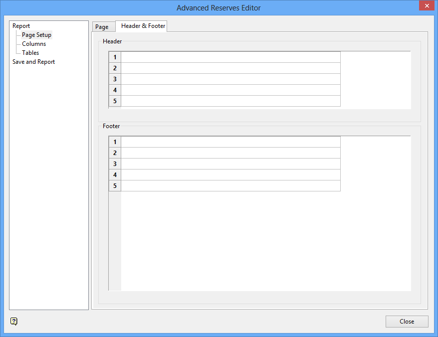 Specify the header information. Up to 5 lines can be specified with each line containing up to 256 alphanumeric characters. The page header appears at the top of each page. The header lines are included in the maximum number of report lines specified.