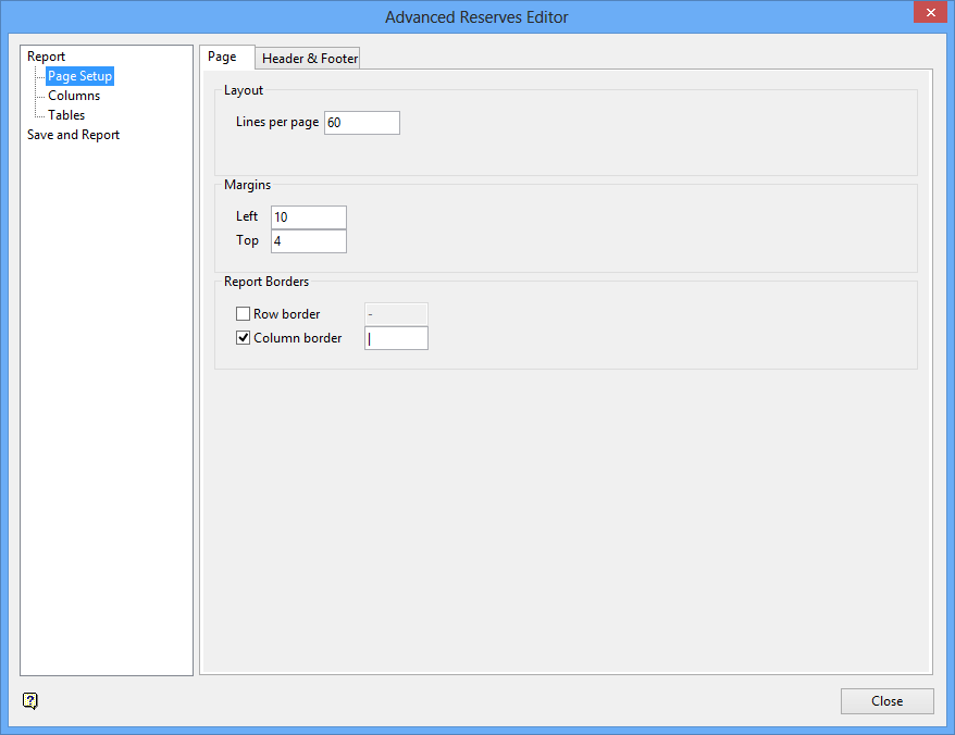 Use this section to set the general parameters that are to be applied to all tables in a report, For example, lines per page, margins, page heading etc.