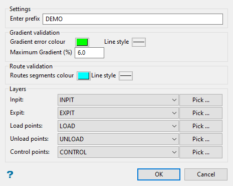 Select a Gradient error colour and line style by clicking on either of the two icons. The sections of the polylines where the gradient threshold is exceeded will be identified using this setting.