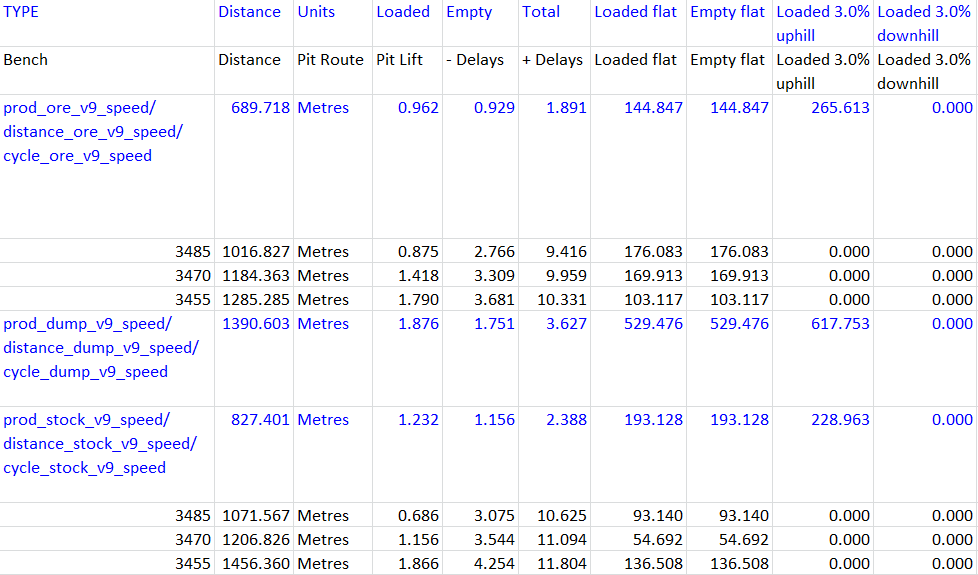 In a Model Route Calculation report, pit lift refers to the vertical distance to the surface. In the Loaded 3.0% uphill column and other similar columns, the percentage refers to the Grade Cutoff or equivalent Rimpull Cutoff described in Truck Definition > Performance.