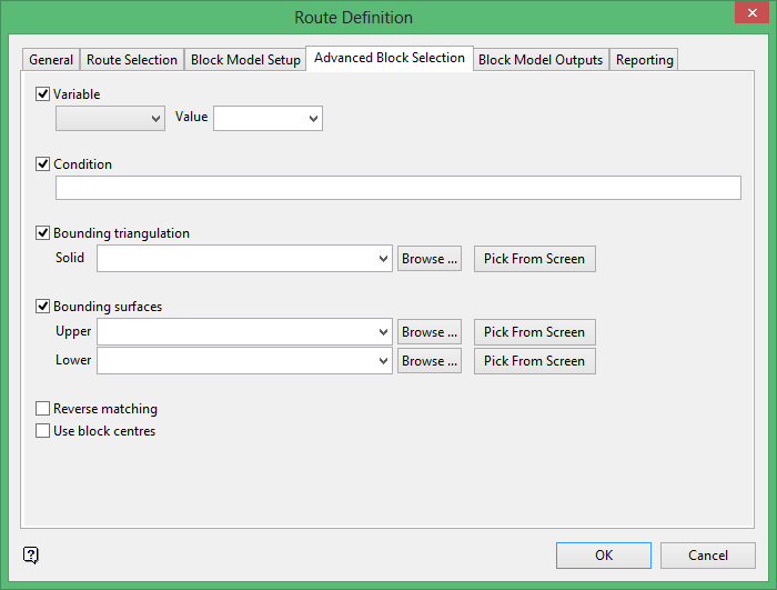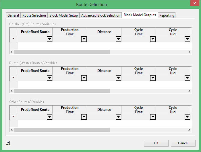 The category to be configured in this panel depends on whether the Material code set in Block Model Setup references a type of Ore, Waste or Other material. If one of the Ore, Waste, Other categories in the Block Model Setup panel does not have a material variable configured, then the corresponding Routes/Variables section in this panel will be unavailable.