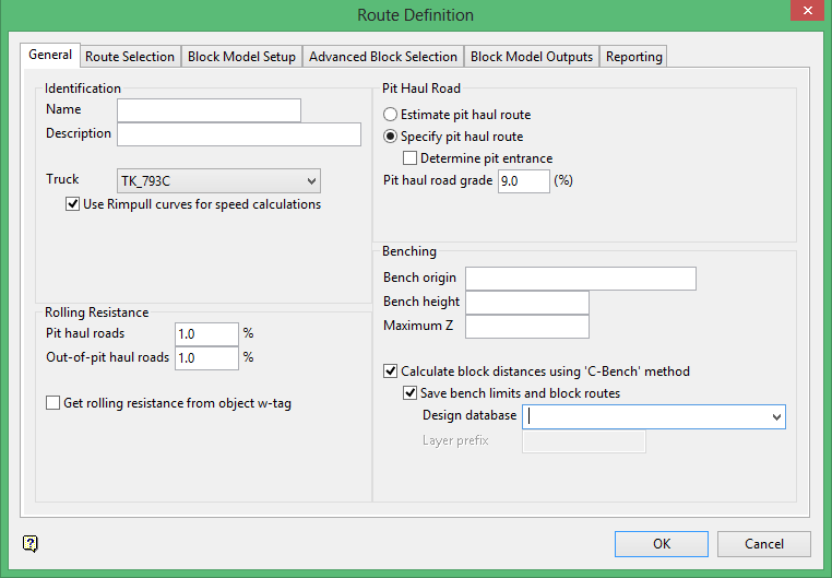 On the Open Pit menu, point to Haulage Profile, and then click Model Route Calculation to display the Model Route Calculation panel.
