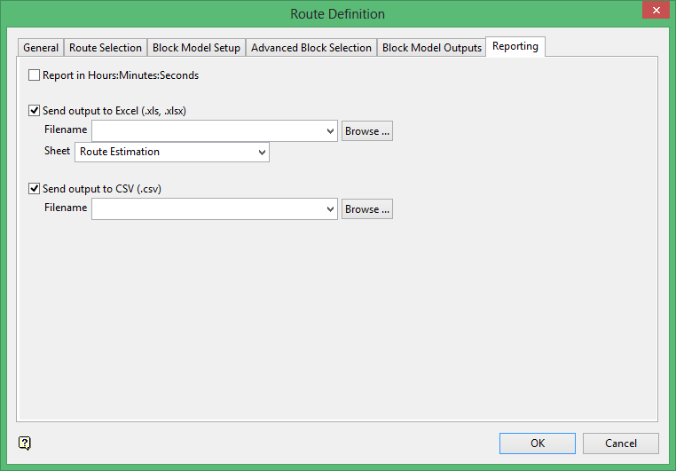 Use this panel to configure how to report the results of Route Definition calculations. The report essentially shows the average time for a truck to transport a block on a route from a bench.