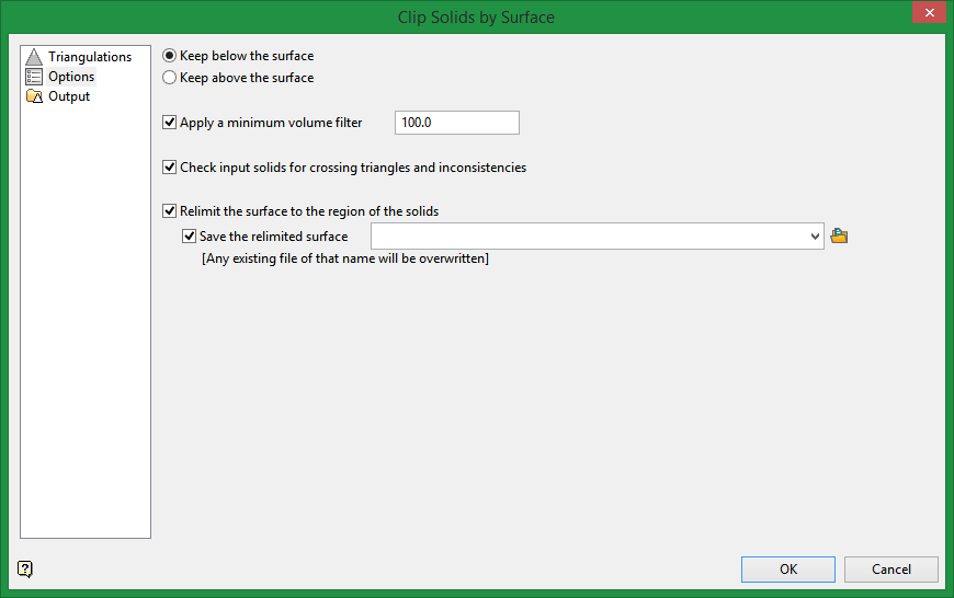 This is an option for clipping solids by a surface. It is designed to support clipping a large number of solids by a single surface. The solids which remain after the clipping can optionally be saved to a separate folder and/or have a prefix added to their name. Optionally, a volume filter can be applied which will delete any solids less than the given volume minimum value. If a solid is clipped into more than one piece, each piece must pass the minimum volume test or it will not be retained.