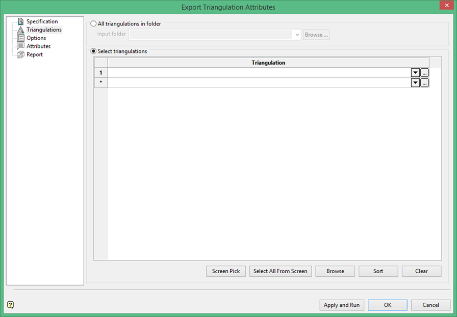 Select the triangulations that you want to export attributes for. Â You may select triangulations in bulk by choosing a folder where triangulations are stored or select individual triangulations.