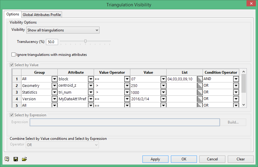 The Select by Value conditions can be combined with an expression provided by the Expression Builder control or manually entered at the Expression edit box. The combined expression creates the triangulation visibility criteria that is applied to the loaded triangulations.