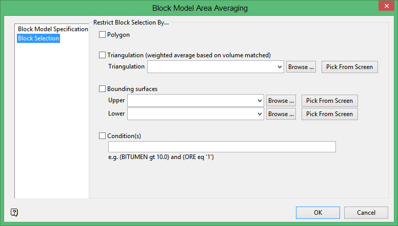 This section of the interface to apply selection criteria to the nominated block model, that is, limit by polygon, triangulation, bounding surfaces and/or condition. You have the ability to use one or more of the available limiting tools.