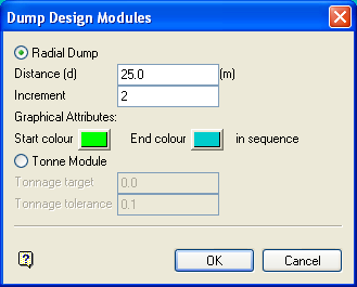 Select this option to create a radial dump. You will need to specify the distance of the radial dumps (from the base dump) and the number of radial dumps. You will also need to select the colour sequence for the dumps.