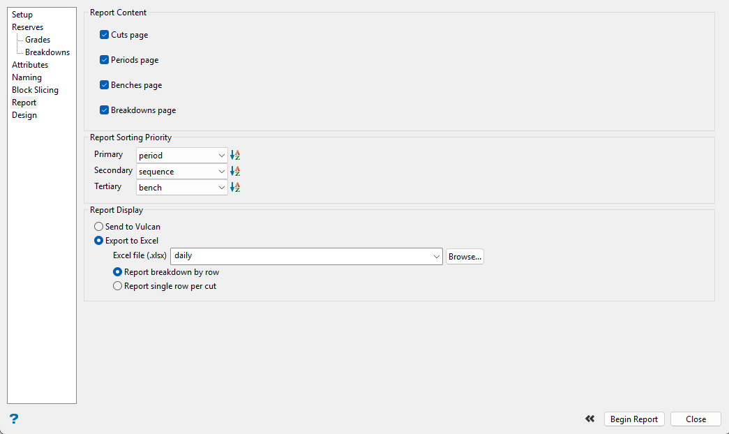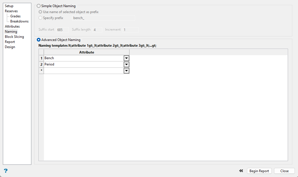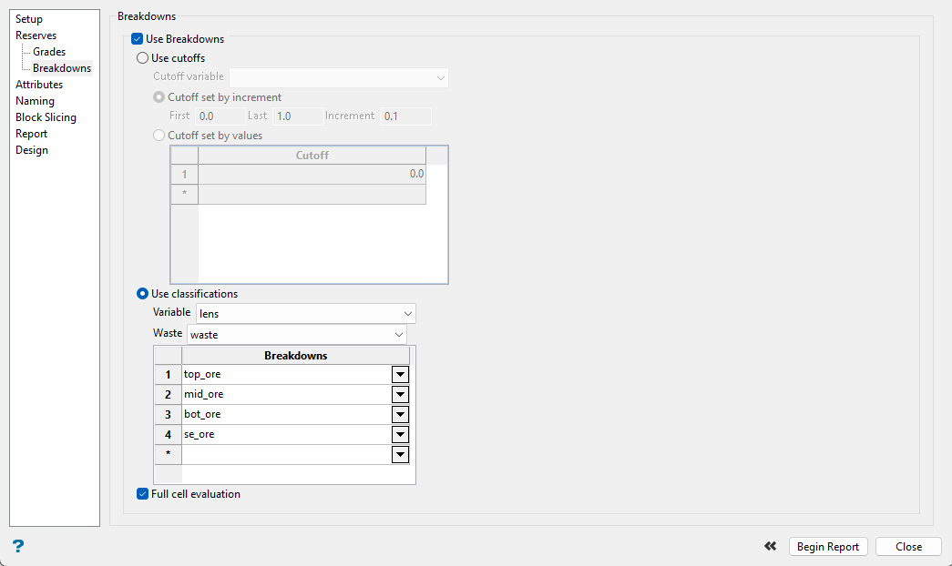 Using this pane is optional. It is used to set up how you want to breakdown the report. You can use a series of cutoffs, or set up a classification scheme such as reporting by geology, ore type, etc.