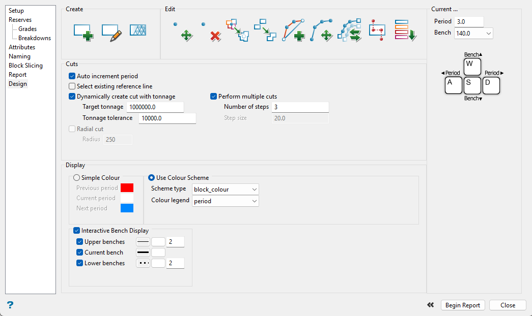 Use this pane to define how your cuts will be made. You can make single cuts based on digitising a line by hand, cuts based on tonnage, and make a series of multiple cuts automatically based on distance or tonnage. You can also perform interactive modifications to existing cuts lines.