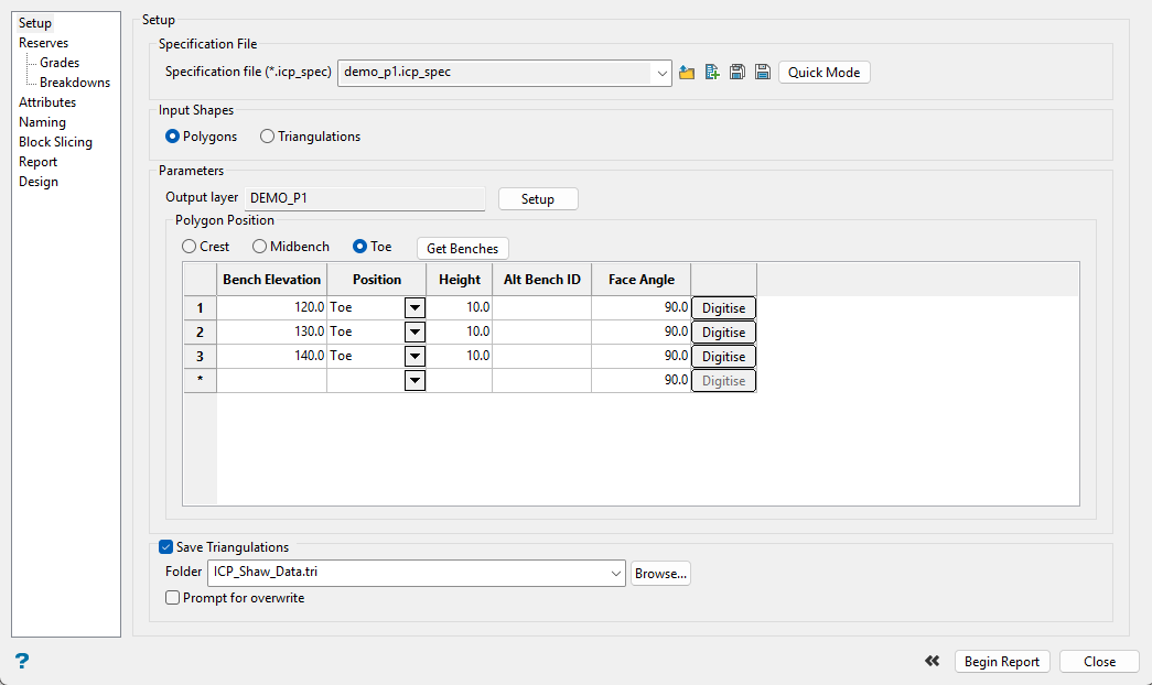 Use this pane to create a new specification file or load an existing one, define the polygons or triangulation solids you want to use as your input bench data, and set up where to store the resulting output.
