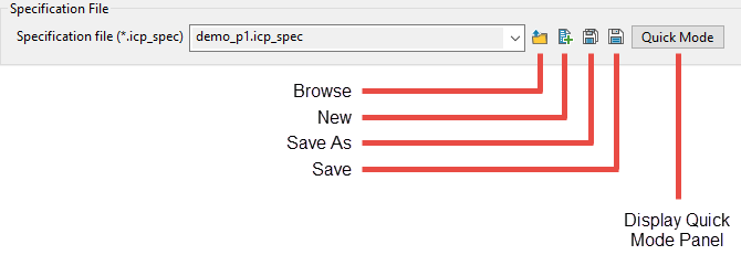 Use the icons to browse for a specification file in a location other than your current working directory, creating a new specification file, or save one.