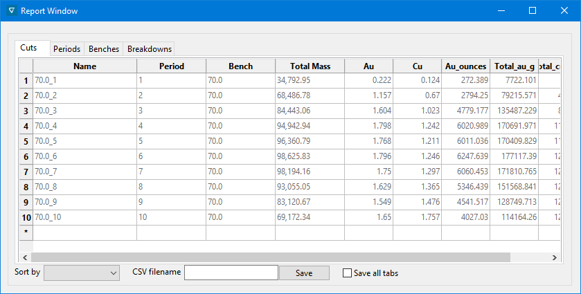 As each cut block is created, it is immediately reconciled against a block model (if you are looking at grades instead of just density.) The cut's reserves are added to a reserve total of all the current cuts, and compared against a target reserve. If the target is not reached, then the cut can be interactively modified and re-included in the reserve total until it is satisfactory. A sequence of cuts from several benches can be designed in this manner. The cut reserves are displayed in the Report Window of Vulcan.
