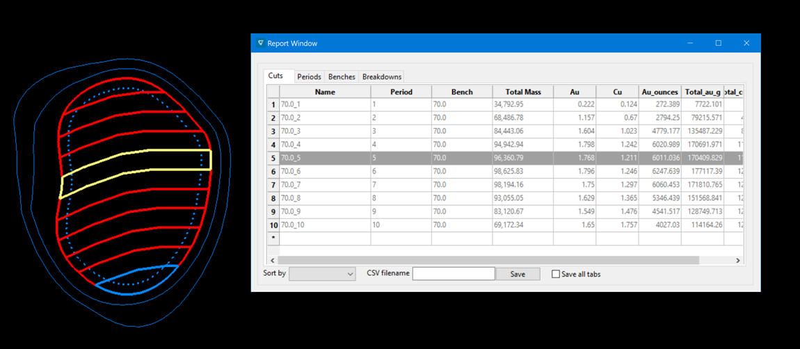 When confirming the cut, tonnage and grade information are displayed as labels, and are output to Vulcan's Report Window.