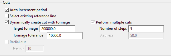 Dynamically create cut with tonnage - Select this option if you want Vulcan to adjust your cut line automatically to create a cut that gives the required tonnage entered in the Target tonnage field.