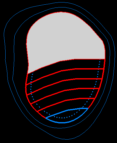 Select the side of the cutting surface to use when making your cut. Two polygons will be created, one showing the area between the last cut and the cut line, and the other showing the remainder of the bench.