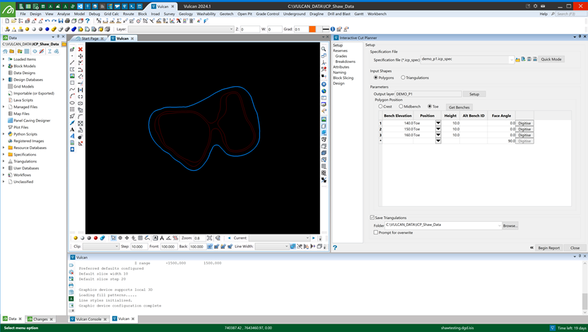 Click the Quick Mode button on the setup pane of the Interactive Cut Planner panel, or right-click on a loaded triangulation and select ICP quick mode. The following panel will be displayed.