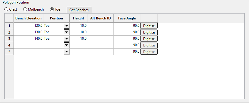 Note: Â If you do not populate the table using the Get Benches button, you will need to fill it in one row at a time, then click the Digitise button to draw the bench polygon.