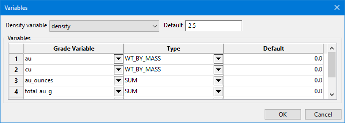 Select Use density and grade variablesto setup customised calculations using the Variablespanel.