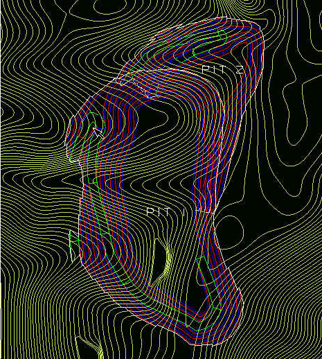 The option takes the current topography and clips any objects inside the intersection polygon and above the specified elevation for that period. It then copies back into the layer any objects from the design layer that are above the specified ending elevation. This process is repeated for each pushback in the order that the pushbacks are specified. The design layer is then used as the starting topography layer for the next period. This is repeated until a progress map layer has been generated for the number of periods specified.