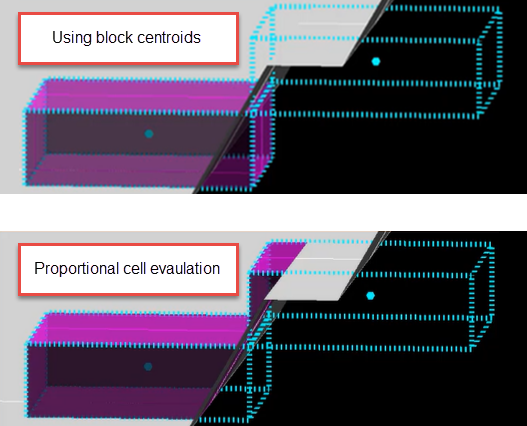 - Proportional cell evaluation: Include those blocks that touch the region, and evaluate reserves according to the proportion of the block's volume that lies in the region. Proportional cell evaluation calculates and reports the exact proportion of a block in a solid triangulation. When selecting blocks, all blocks that touch the region are selected.