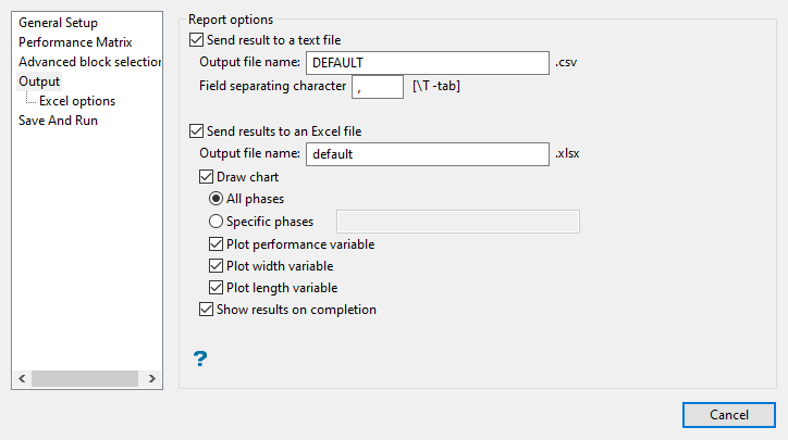 Select this check box to plot the performance variable in the resulting Excel spreadsheet. The performance variable is defined through the General Setup section of the Performance by phase-bench interface.