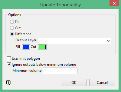 Select Difference from the Options menu. Select an output layer from the drop-down list or enter a name for a new layer. Then select the colours to represent areas of Fill and Cut.